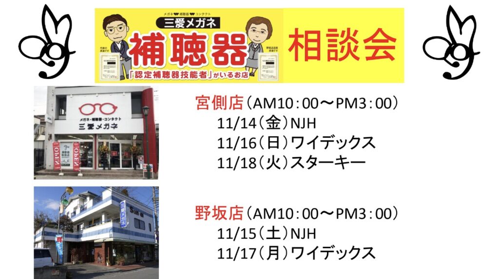 11/14(金)〜18(火)補聴器🦻相談会🦻 2025年11月8日 最終更新日時 : 2025年11月8日 sanaimegane こんにちは😁 ウニクス店の土屋です‼︎ 来週はいよいよ補聴器相談会となります🦻 下記の日程にて各店舗 各メーカーの方に 補聴器の調整やクリーニングなどを実施致します😌 相談会期間中は電池がお買い得!!🔋🉐 300円→270円‼️ ※ウニクス店は電池のみ販売しております😌 ※宮側店は水曜日 補聴器お休みとなります😌 補聴器が気になっている方も是非お越し下さい🦻✨ 三愛メガネには 認定補聴器技能者がおります😊 Follow me!