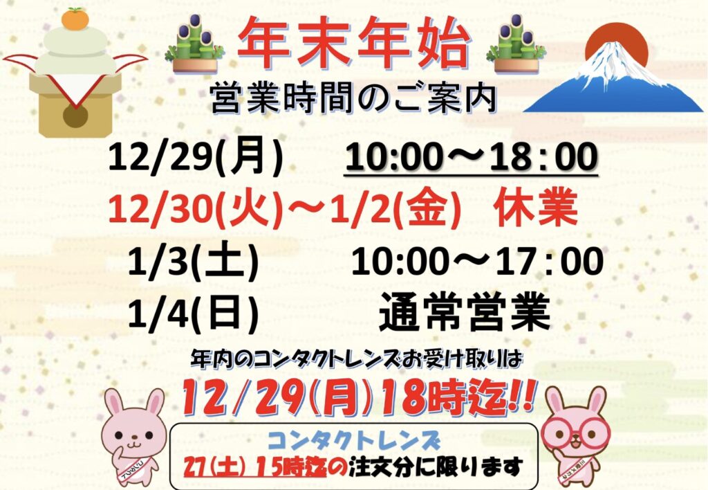 年末年始の営業のご案内🗓️ 2025年12月4日 最終更新日時 : 2025年12月4日 sanaimegane 年末年始の営業につきまして 下記の画像をご覧下さい😌 コンタクトについて 年内のお受け取りは29日(月)18時まで ※27日(土)15時までのご注文分に限ります😌 コンタクトご注文はお早めに😊 Follow me!