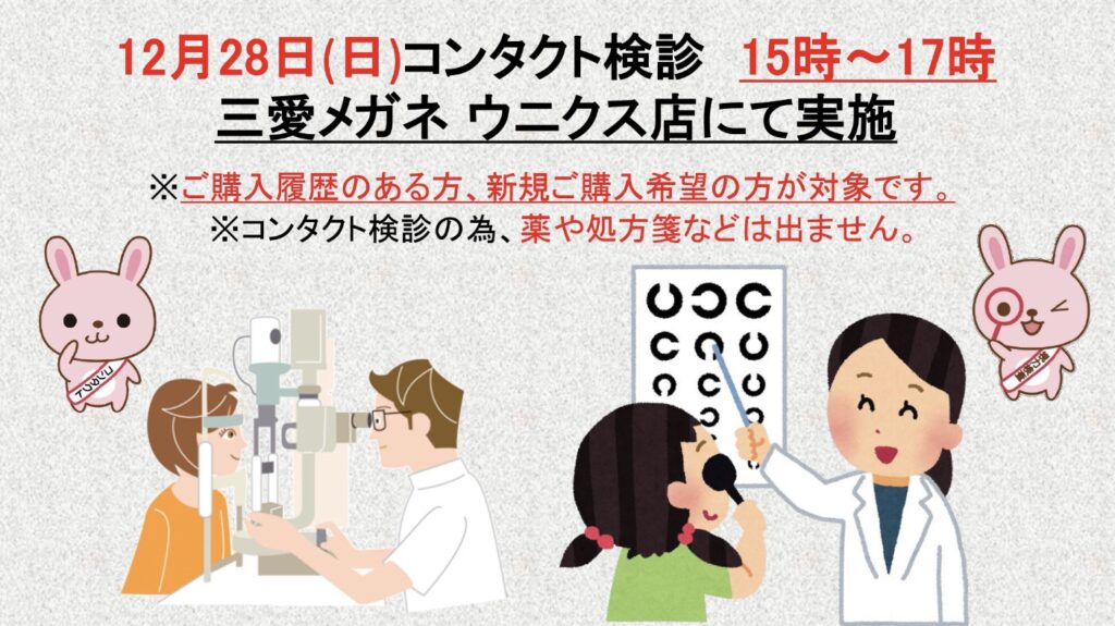 12/28(月)15時〜17時 コンタクト検診👀 2025年12月21日 最終更新日時 : 2025年12月21日 sanaimegane こんにちは😁 ウニクス店の土屋です‼︎ 来週は いよいよコンタクト検診👀✨ ※ご購入履歴のある、新規でご購入希望の方が対象です ※コンタクト検診のため、薬や処方箋などは出ません 眼の表面が気になる方やコンタクトを使いたい方 是非この機会をご利用下さい😊 Follow me!