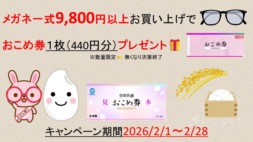 2月のキャンペーンは🌾🎫 2026年2月1日 最終更新日時 : 2026年2月1日 sanaimegane 2月は メガネ一式9,800円以上ご購入で👓✨ おこめ券1枚(440円分)プレゼント!!🌾🎫🎁 ※おこめ券🎫数量限定 無くなり次第終了となります😌 ※おこめ券🎫ご利用方法については ご利用店舗にてご確認をお願い致します😌 Follow me!