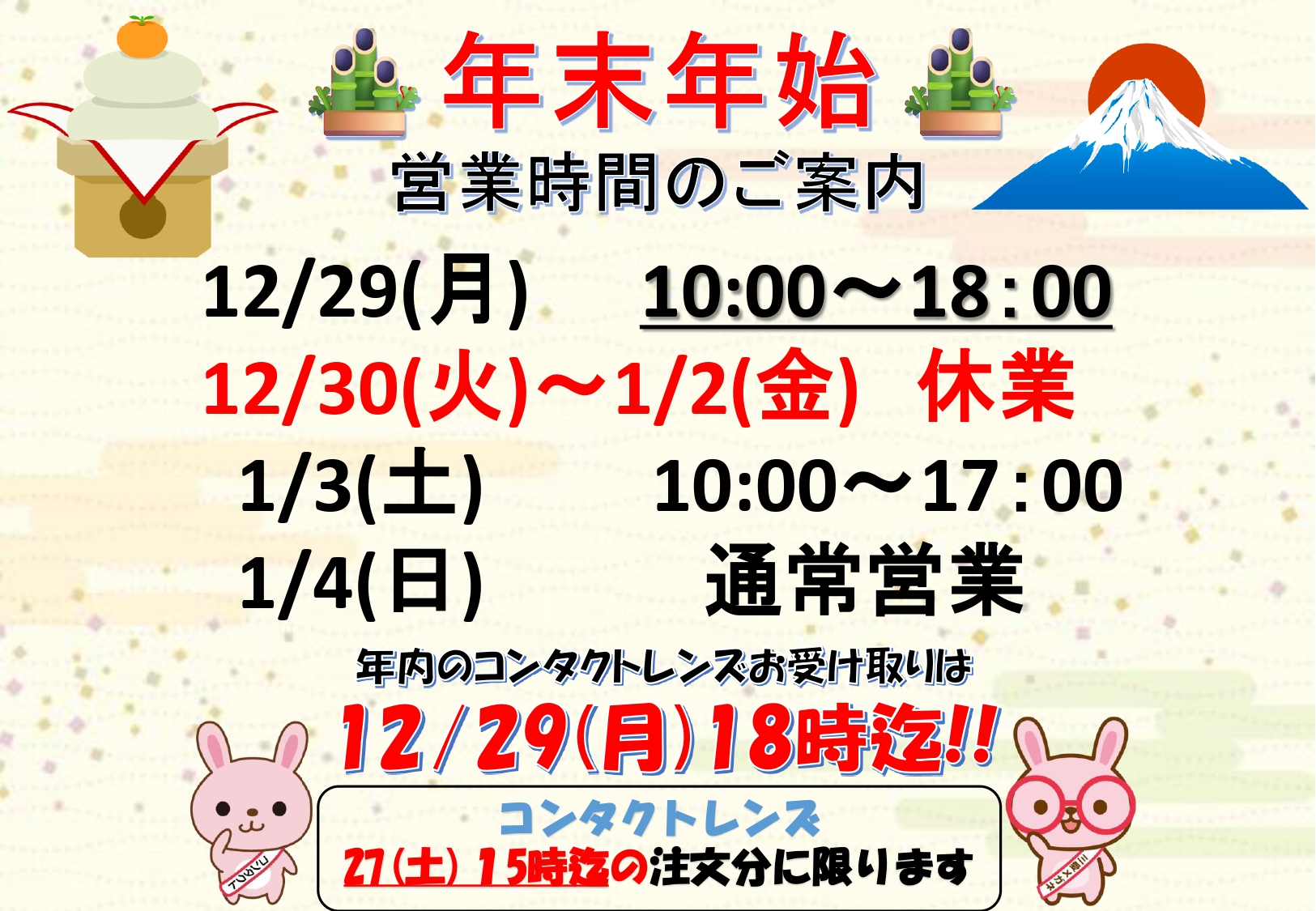 年末年始📅営業時間のご案内🕙 2025年12月20日 最終更新日時 : 2025年12月20日 sanaimegane 年内は12/29(月)18時までの営業となります。 年始は1/3(土)より営業となります。※3(土)は17時まで 1/4(日)より通常営業です。 コンタクトレンズ👀 年内のお受け取りは 12/27(土)15時までのご注文分に限り 12/29(月)18時までとなります。