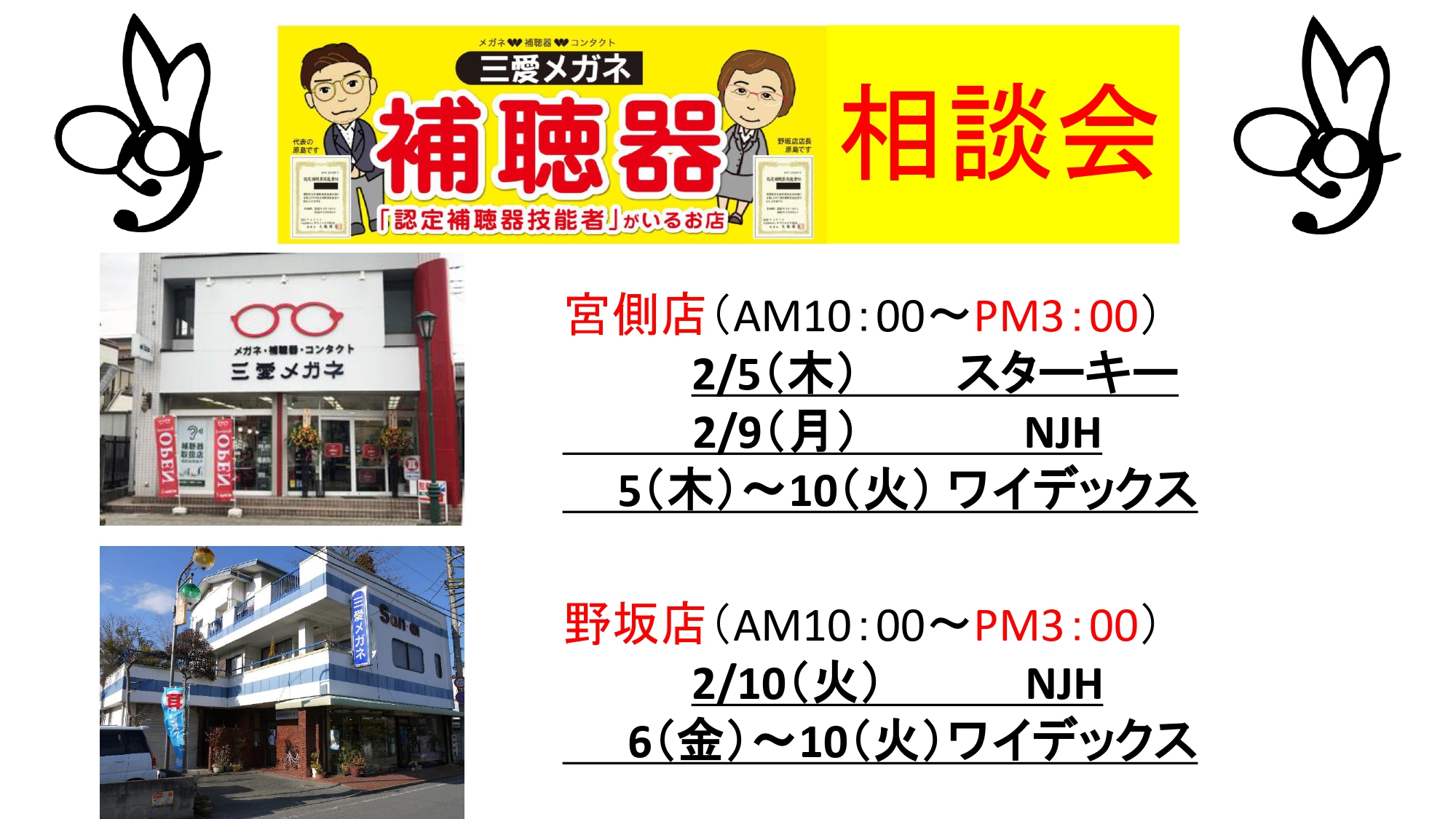 👂補聴器相談会👂※日程にご注意下さい📅 2026年2月1日 最終更新日時 : 2026年1月19日 sanaimegane 2月は補聴器相談会です!!👂日程にご注意下さい 下記をご覧下さい 2/5(木)~2/10(火) AM10時~PM3時 各店舗 各メーカー 補聴器相談会 期間中は電池がお買い得です!! 300円➔270円 宮側店(AM10時~PM3時) 2/5(木) スターキー 2/9(月) NJH 2/5(木)~10(火) ワイデックス 野坂店(AM10時~PM3時) 2/10(火) NJH 2/6(金)~10(火) ワイデックス