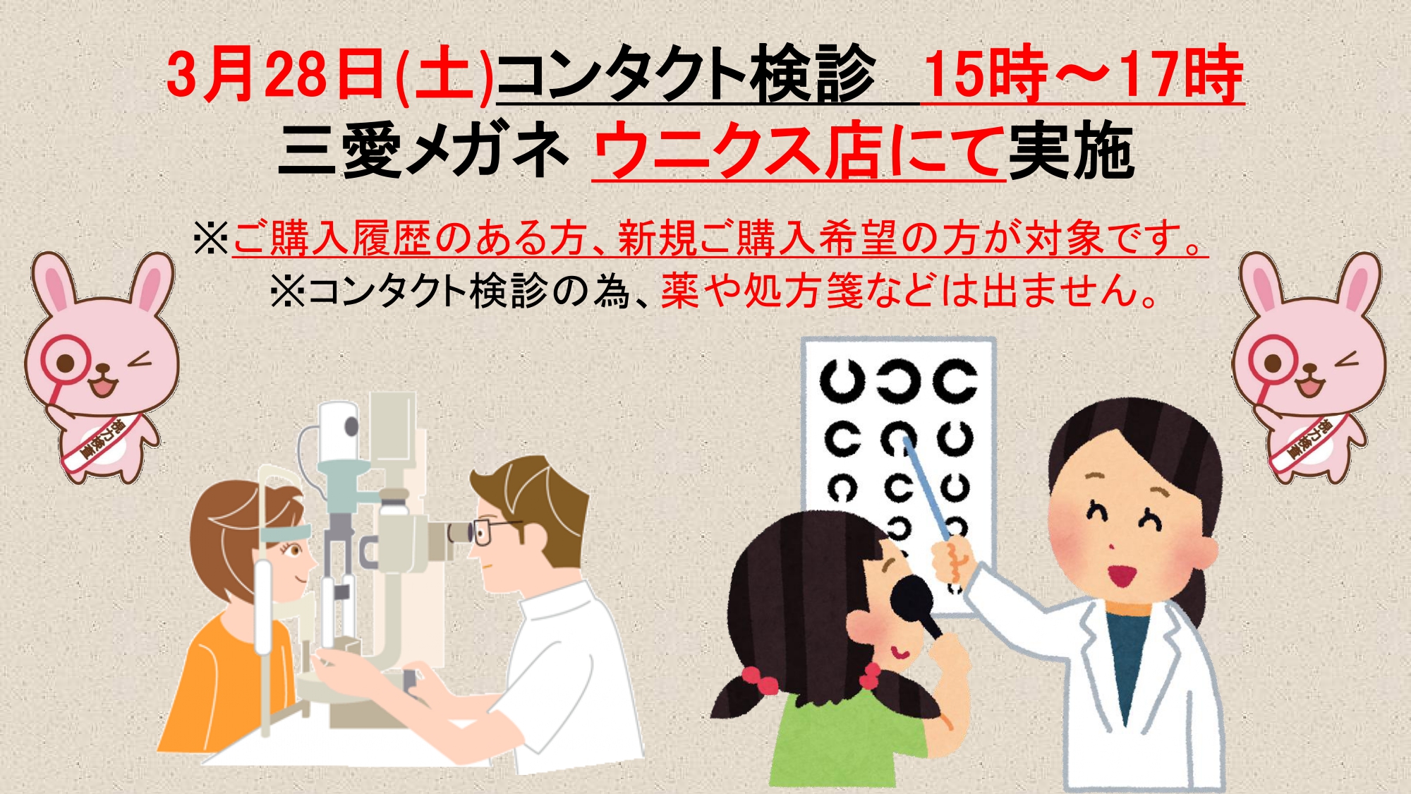 3/28(土)コンタクト検診👀✨ウニクス店にて15時~17時📅 2026年3月1日 最終更新日時 : 2026年2月22日 sanaimegane コンタクト検診👀 3月28日(土)15時~17時 ウニクス店にて ※ご購入履歴のある方、新規ご購入希望の方が対象 ※コンタクト検診の為、薬や処方箋などはでません 目の表面が気になる方👀やコンタクトレンズを使いたい方✨ 是非この機会をご利用下さい!!